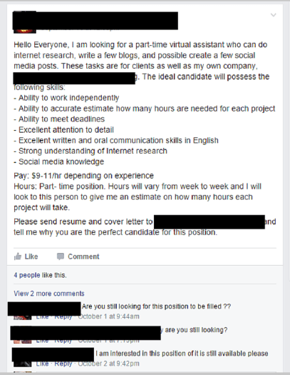 I think a lot of us have seen this before. We may belong to some online groups or forums that advertise of a virtual assistant opening. Take a look at this example: